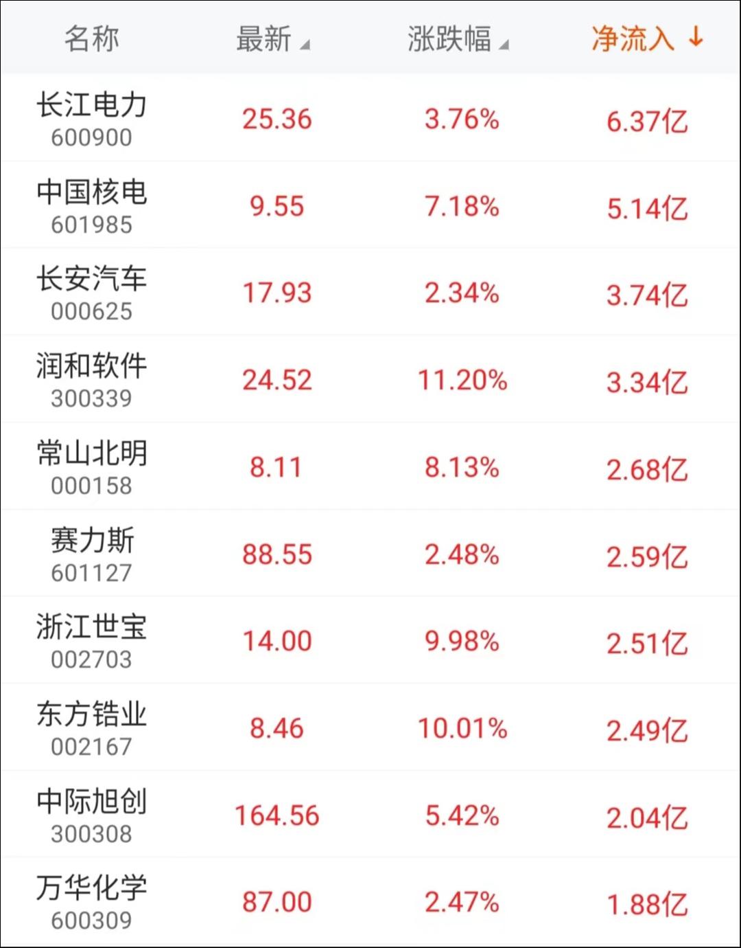 主力资金净流入最高的个股为长江电力,流入金额6.37亿元,其次是中国核电,流入金额5.14亿元。