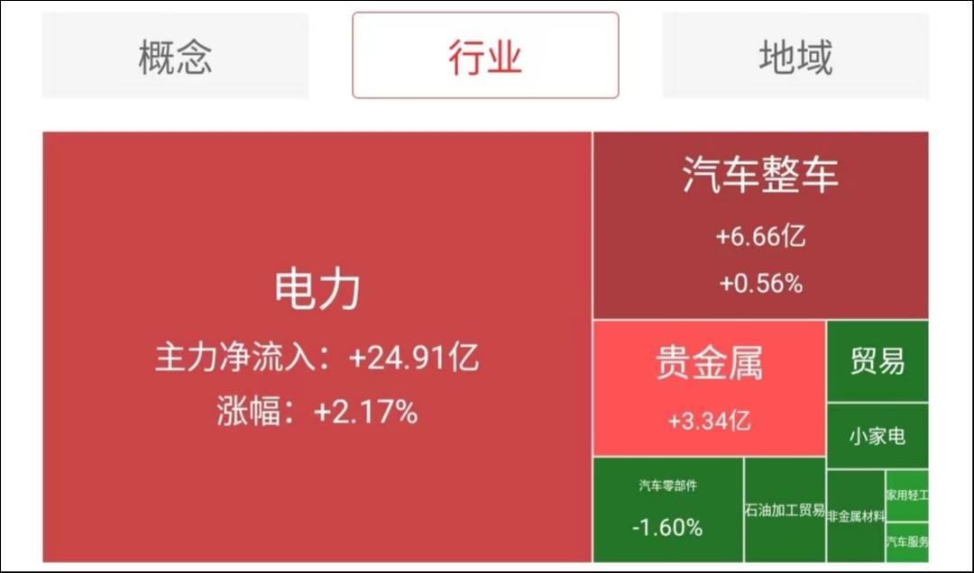 主力资金净流入最多的行业板块是电力、汽车整车,流入最多的概念板块是绿色电力、核电、央企国企改革概念板块。