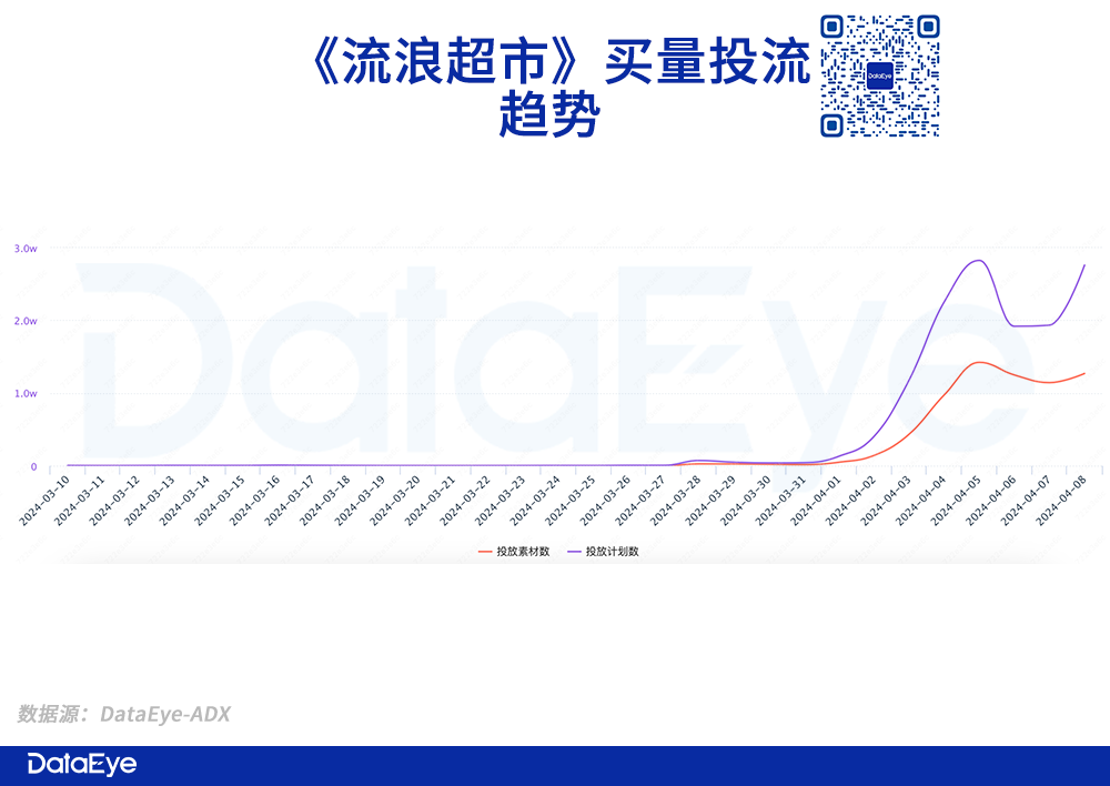 DataEye-ADX数据显示,《流浪超市》小游戏买量素材3月28号开始投放,此后持续增加,4月5号当天视频+图片超1.4万,此后几天未跌下过1万。截至8号的近7天,该游戏位列微信小游戏素材榜第二,仅次于《寻道大千》,超越了一众老牌爆款产品。