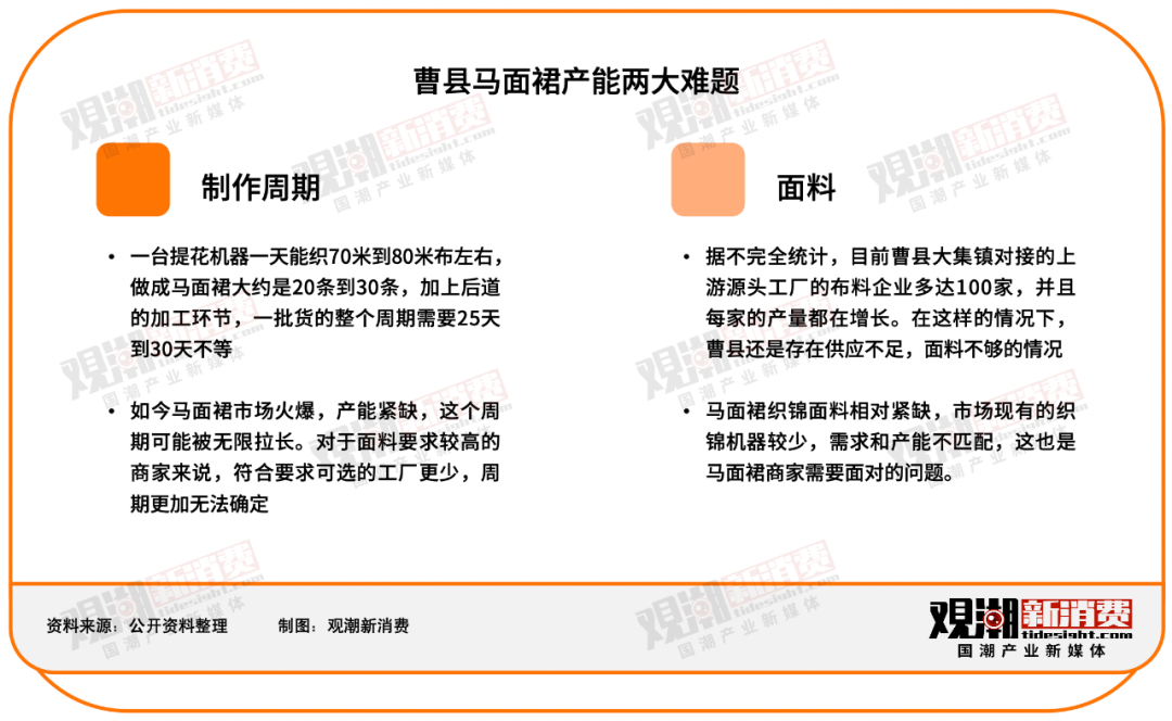 然而马面裙的火爆还是超出了预期。从制作周期上,马面裙工序相对复杂,再加上市场火爆,产能紧缺,制作周期被无限拉长;从面料上,马面裙织锦面料相对紧缺,市场现有的织锦机器较少,需求和产能不匹配。