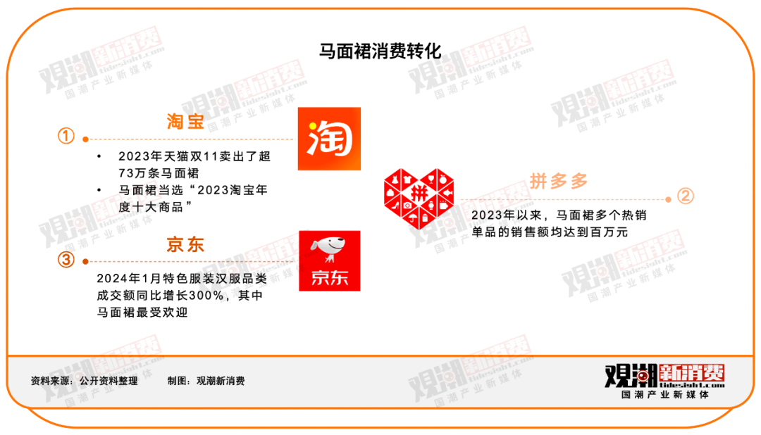 天猫平台增速相对较高,一方面是汉服品牌的正规化趋势,推动旗舰店数量增长;另一方面是马面裙的火爆引发部分女装品牌重视,尝试推出马面裙单品,带动天猫平台的销售增长。