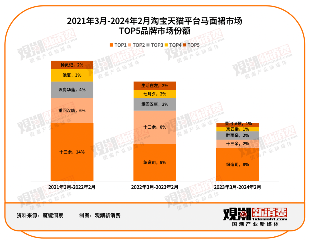 风潮袭来,一批又一批新的品牌诞生。从市场格局来看,天猫、淘宝平台上,品牌集中度持续下降,CR5由2021年的29%下滑至2023年的14%,马面裙市场高度分散,竞争激烈。2023年在如火如荼的市场大战中,织造司脱颖而出。![]()
