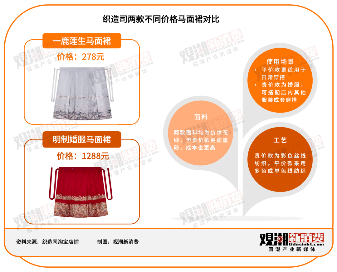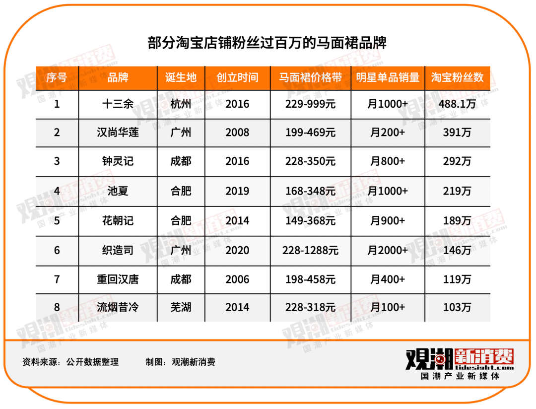 此外,观潮新消费对淘宝店铺粉丝数量过百万的部分品牌进行了整理。分析发现,目前尚未诞生拥有大爆款的马面裙品牌,且品牌覆盖的价格区间类似,多在100至300元。换而言之,目前消费者没有形成较高的品牌认知,主要依托款式和性价比进行消费决策。![]()