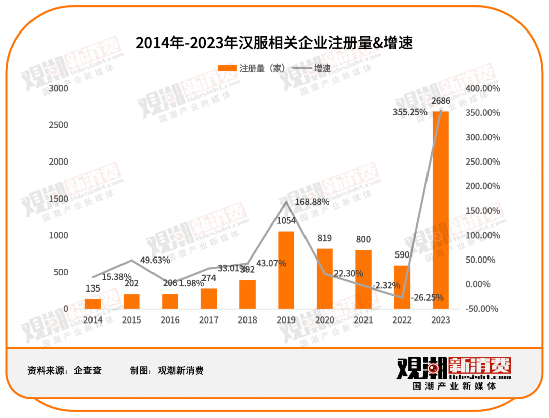 根据企查查数据,截至今年2月,我国现存汉服相关企业5853家。2023年,我国汉服相关企业注册量达2686家,同比增长355.25%,达近十年增速峰值。