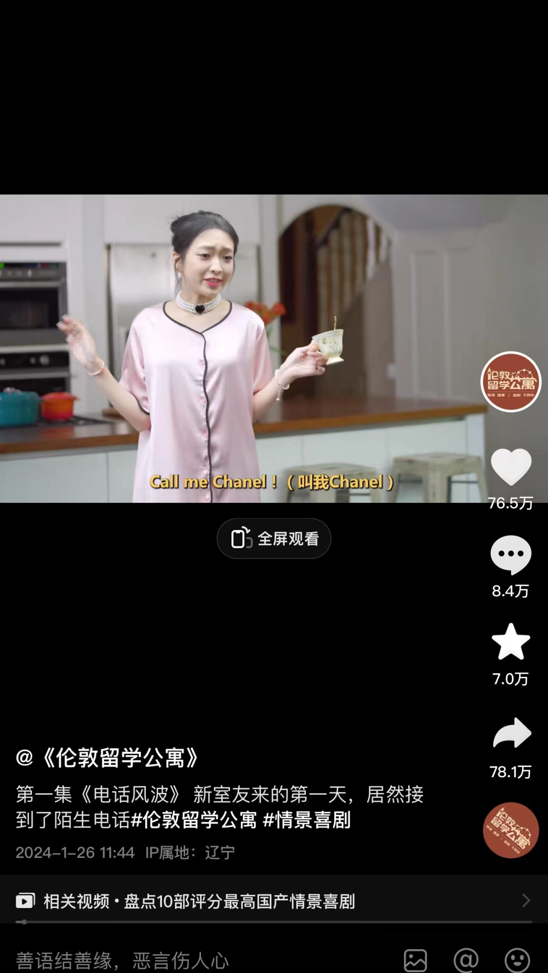 想拍一部有《生活大爆炸》和《是!首相》味道的剧,导演潘庚和编剧于靖平的这一初衷让《伦敦留学公寓》在风格上有别于市面上的大多数短剧,有很强的情景喜剧感,一条「还是我们00后好,赶上了两代人的爱情公寓」的评论获得了17.6万点赞。