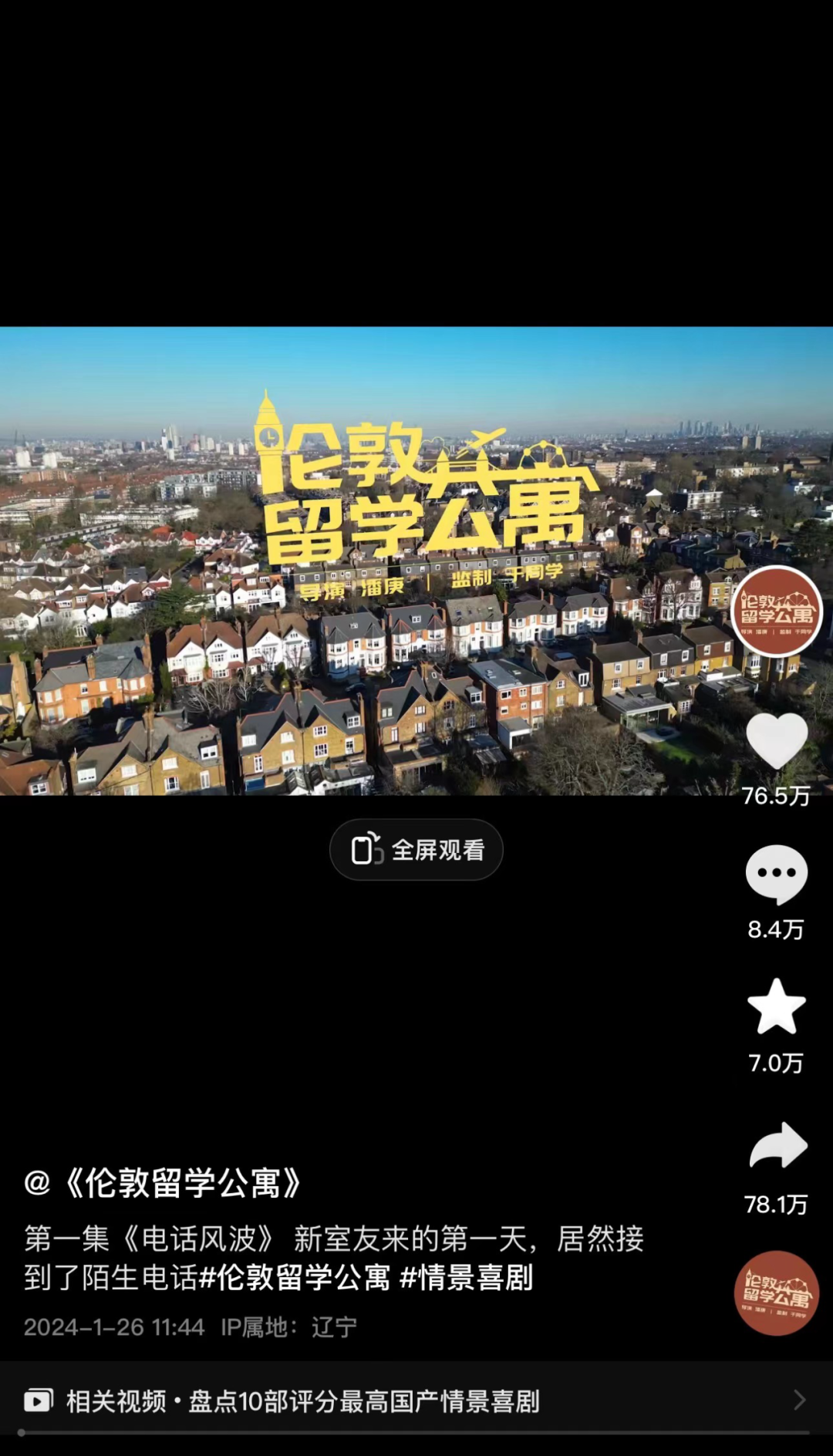 掀起风潮的是1月底上线的短剧《伦敦留学公寓》。由抖音网红「帝国理工于同学」担任监制和编剧,全素人出演的《伦敦留学公寓》上线第一集后,就登上抖音热榜第一,第一季6集完结后,官方抖音账号已经累积91万粉丝。