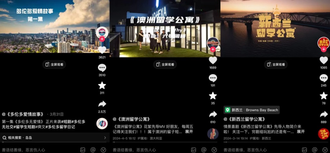 《多伦多留学公寓》,主打渣王海后的爱恨情仇;《澳洲留学公寓》,身体力行地证明了「土澳」是如何同化中国留学生的;《新西兰留学公寓》,抓马风格仿佛在看低配版《小时代》;在小红书等社交平台,巴黎、莫斯科、印度等地的留学公寓短剧正在筹备中。