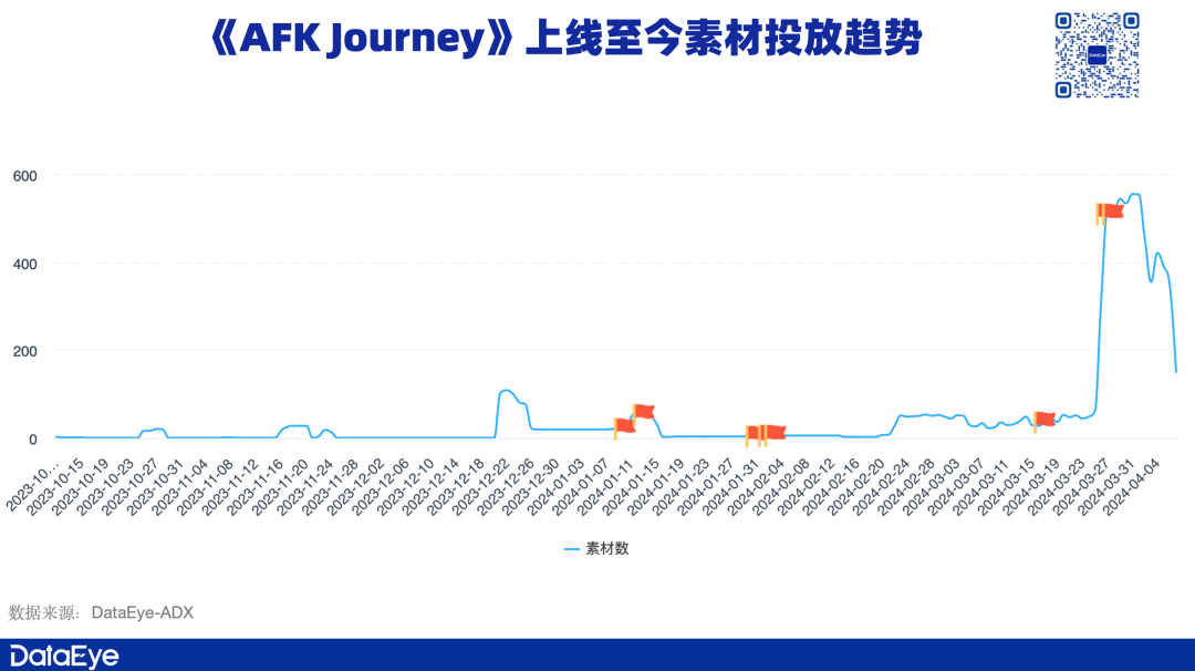 买量投放方面,DataEye-ADX数据显示:《AFK Journey》在去年10月底开始进行素材投放。但日均投放素材并不突出,素材投放量仅有个位数。直到今年3月份,游戏在多个市场上线之后,素材投放量才迎来提升。