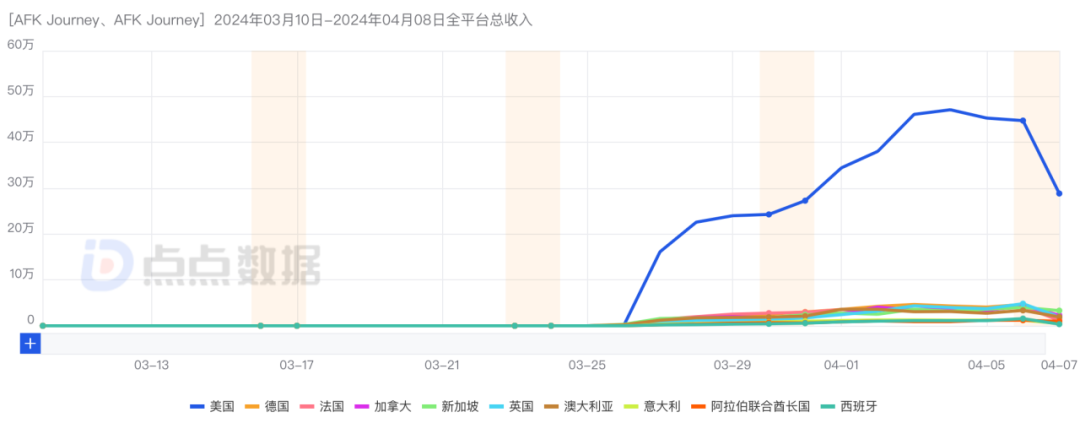 3、下载数据多集中在高付费市场;尤其是美国市场,《AFK Journey》在该市场拿下了较高的下载与付费,美国市场助力是推动《AFK Journey》上线初期收入拉高的重要原因。