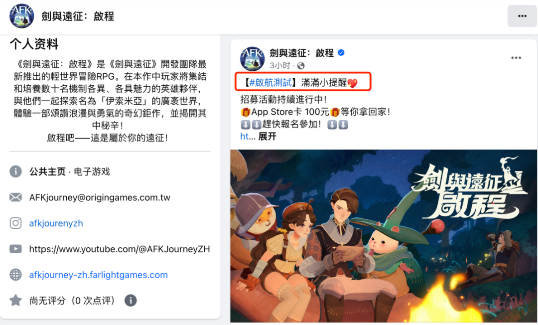 在Facebook平台,《AFK Journey》的主要运营账号有超6.6万的粉丝量,但是以繁体中文为主,且截止至4月7日,该账号仍在发布测试招募相关推文。
