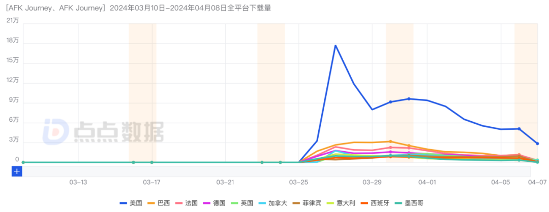点点数据显示,截止至4月7日,《AFK Journey》上线至今,在全球双端市场总下载量超324万次,其中,该产品在美国、巴西、法国等市场较受欢迎。
