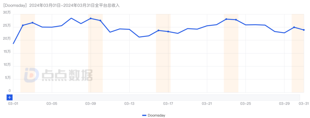 据IGG高管在电话会披露,“《Doomsday》三月流水预计突破1亿港币(约等于9200万元)。”而点点数据显示,《Doomsday》三月在苹果Appstore和Google Play总收入约为5500万元,不扣除平台分成收入约为7800万元。也就是说,《Doomsday》在官网直充的收入可能达到千万元以上。