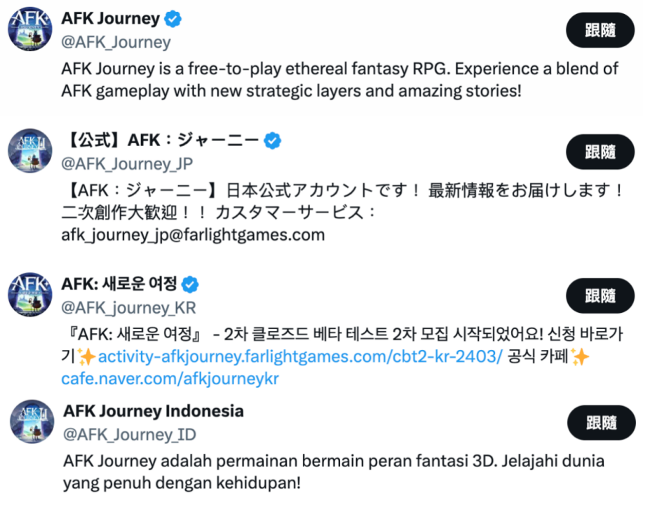 值得关注的是,在在twitter平台,《AFK Journey》还有印尼、日本、韩国三个市场的专属运营账号,且发布的相关推文也多是以招募测试为主。