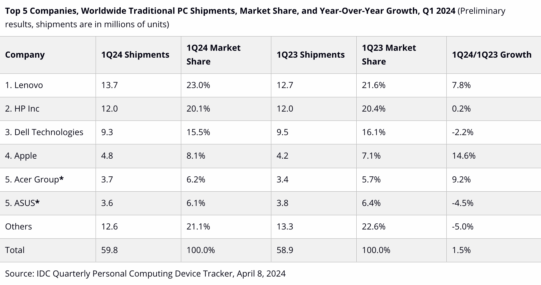 IDC 最新发布的报告表明,全球 PC 市场在经历连续两年的下滑之后,终于在 2024 年第一季度重新恢复增长,出货量达 5980 万台,同比增长 1.5%。