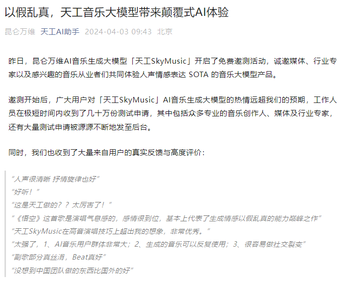 4月2日,昆仑万维推出了国内首款且唯一对外开放的AI音乐生成大模型“天工SkyMusic”,并宣布即日起面向社会开启免费邀测。资料显示,该大模型能够支持生成80秒44100Hz采样率双声道立体声歌曲。后续还将逐步迭代和添加多模态的情感理解与表达能力。