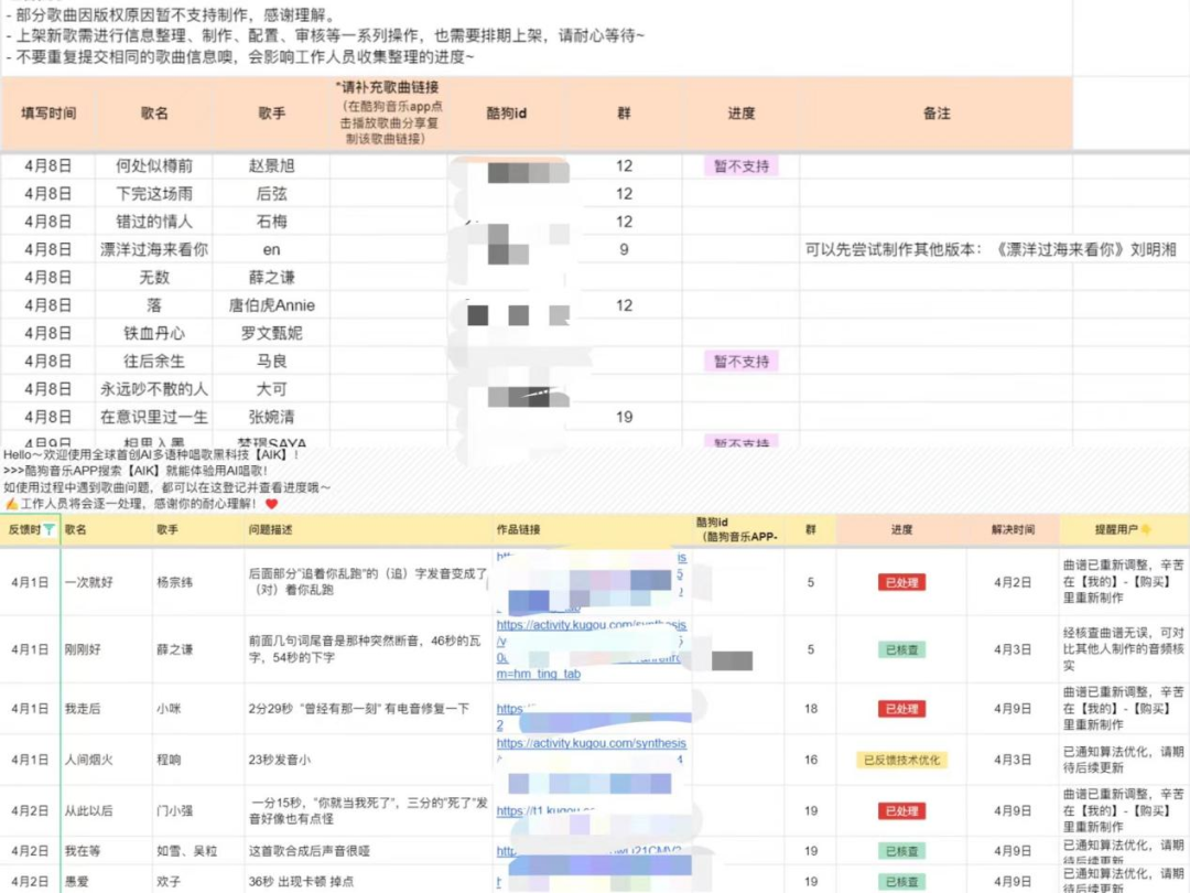 待在酷狗AIK用户交流群里的这半个月里,周同围观了数个同好向客服反馈的奇葩问题,“本来只是进群催催我想要的歌曲版权,但没想到AI翻唱的技术BUG会出得这么有特色。”