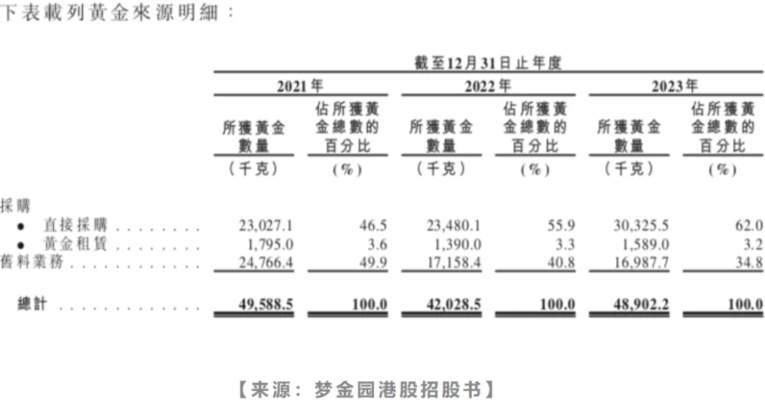 目前,梦金园的黄金来源包括采购和旧料业务,其中采购主要来自直接采购和黄金租赁,主要从上海黄金交易所及其会员直接采购黄金,以及通过商业银行借贷黄金。而旧料业务,则是来自加盟商旧料结算及消费者以旧换新所获取的黄金旧料。