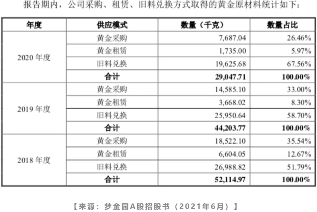 在梦金园2021年6月更新的A股招股说明书中,2018年、2019年、2020年的黄金原料供应结构中,旧料兑换获取黄金量占比分别为51.79%、58.70%和67.56%,远高于直接采购黄金量的占比(注:直接采购三年占比分别为35.54%、33.00%和26.46%)。