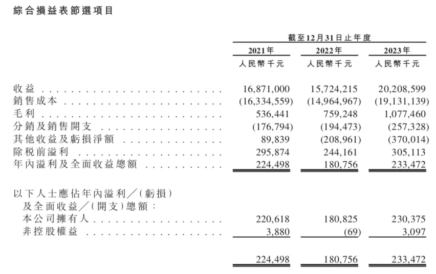 在毛利及毛利率表现上,截至2021年、2022年及2023年12月止年度,梦金园的毛利润分别为5.36亿元、7.59亿元、10.76亿元,毛利率分别为3.2%、4.8%、5.3%。对于这种毛利增长的原因,梦金园称主要受益于2023年金价持续走高所致,由于在金价开始上涨前以相对较低的价格水平购入黄金,而向客户收取的现行市场金价拟高于公司先前的购买成本。所以在采购和销售交易之间的这种时间差,加上年内金价的持续走高,导致2023年毛利及毛利率增加。