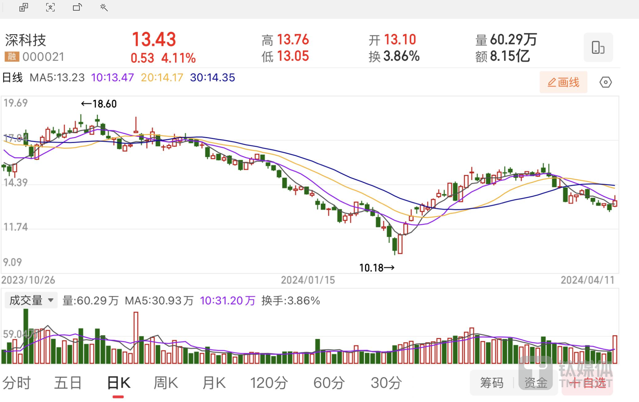 二级市场方面,深科技股价于2月5日盘中创下10.18元的阶段性新低后,股价触底回升。截至4月11日收盘,公司股价报收13.43元,涨幅4.11%,当前总市值为209.6亿元。