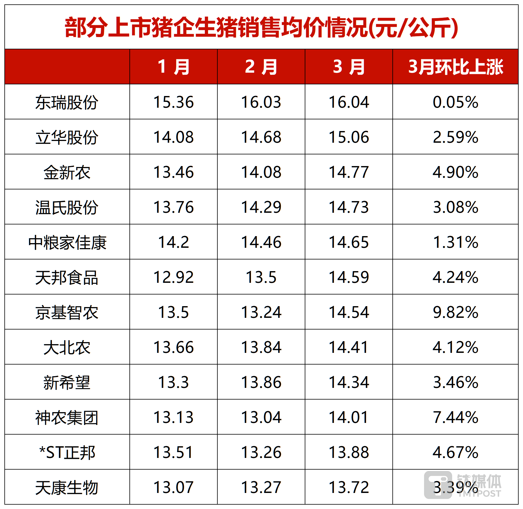 随着猪价回暖,猪企销售均价也环比上涨。据不完全统计,温氏股份、牧原股份、新希望、金新农等13家猪企生猪销售均价实现了环比上涨。