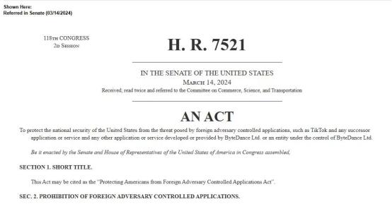3月13日,美国国会众议院刚刚通过一项名为“保护美国人免受外国对手控制应用侵害法”的法案,要求字节跳动必须在165天内剥离TikTok,否则其将在美国境内被禁用。延长期限后,参议院仍有可能接受该项法案——通过对法案措辞的调整,或许将使其更加无懈可击。