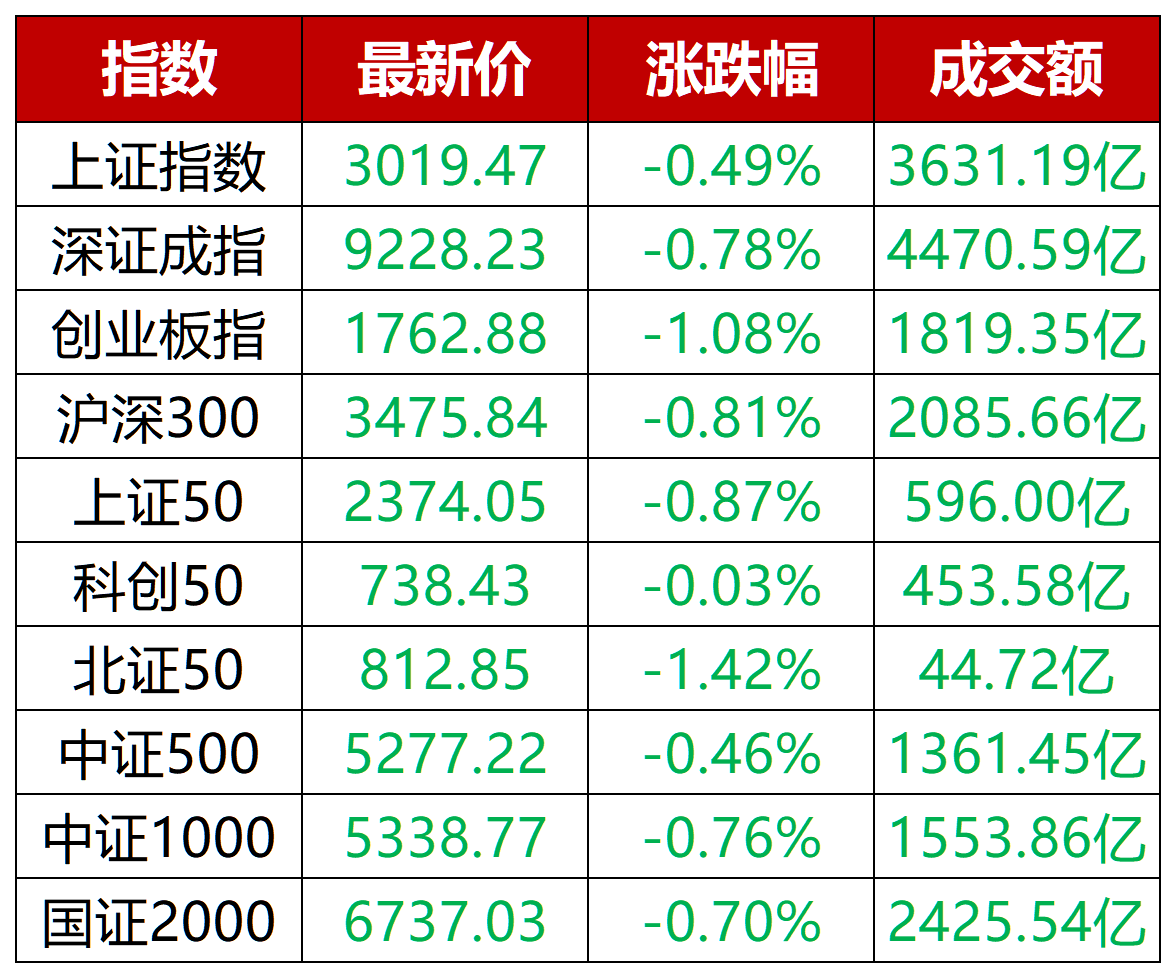 4月12日早盘三大指数震荡下行,午后快速反弹后尾盘再度加速下杀,在3月宏观数据不及预期以及财报月不确定性情绪带动下,市场信心仍然偏弱,成交继续处于低位,各成分股指数也全线下跌。