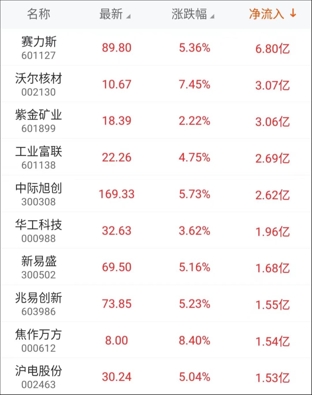 主力资金净流入最高的个股为赛力斯,流入金额6.80亿元,沃尔核材、紫金矿业主力净流入金额均超3亿元。