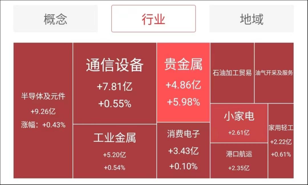 主力资金净流入最多的行业板块是半导体及元件、通信设备、工业金属板块,流入最多的概念板块是人民币贬值受益、黄金概念、共封装光学(CPO)板块。