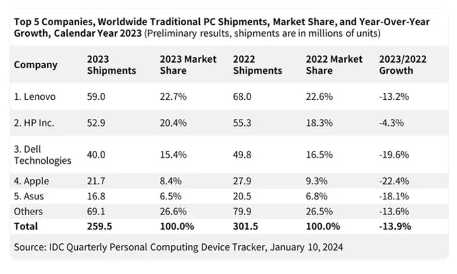 数据调研机构IDC发布的2023年全年全球PC销量情况显示,2023年四季度,全球PC出货量约为2.595亿台,同比2022年下降了13.9%。其中苹果出货量排名第四,同比下滑22.4%。尽管苹果2023年第四季度的出货量有所改善,同比增加了10.1%,但从全年数据来看,苹果在PC市场的下滑十分明显,下滑幅度远超其他PC厂商。