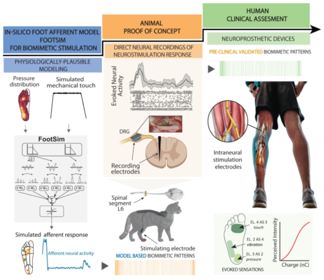 ▷图2:开发一个模仿人体感觉的神经假体的三个关键步骤:首先,使用脚底仿生刺激模型来模拟神经系统是如何处理触觉的。然后,通过在动物身上进行实验来测试这些仿生刺激是否与自然刺激相似。最后,将这种仿生刺激技术植入人体,并在真实的生活环境中测试它的效果。图源:原始论文。