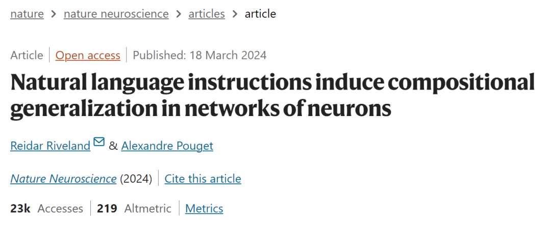 ▷Riveland, Reidar, and Alexandre Pouget. "Natural language instructions induce compositional generalization in networks of neurons." Nature Neuroscience (2024): 1-12.