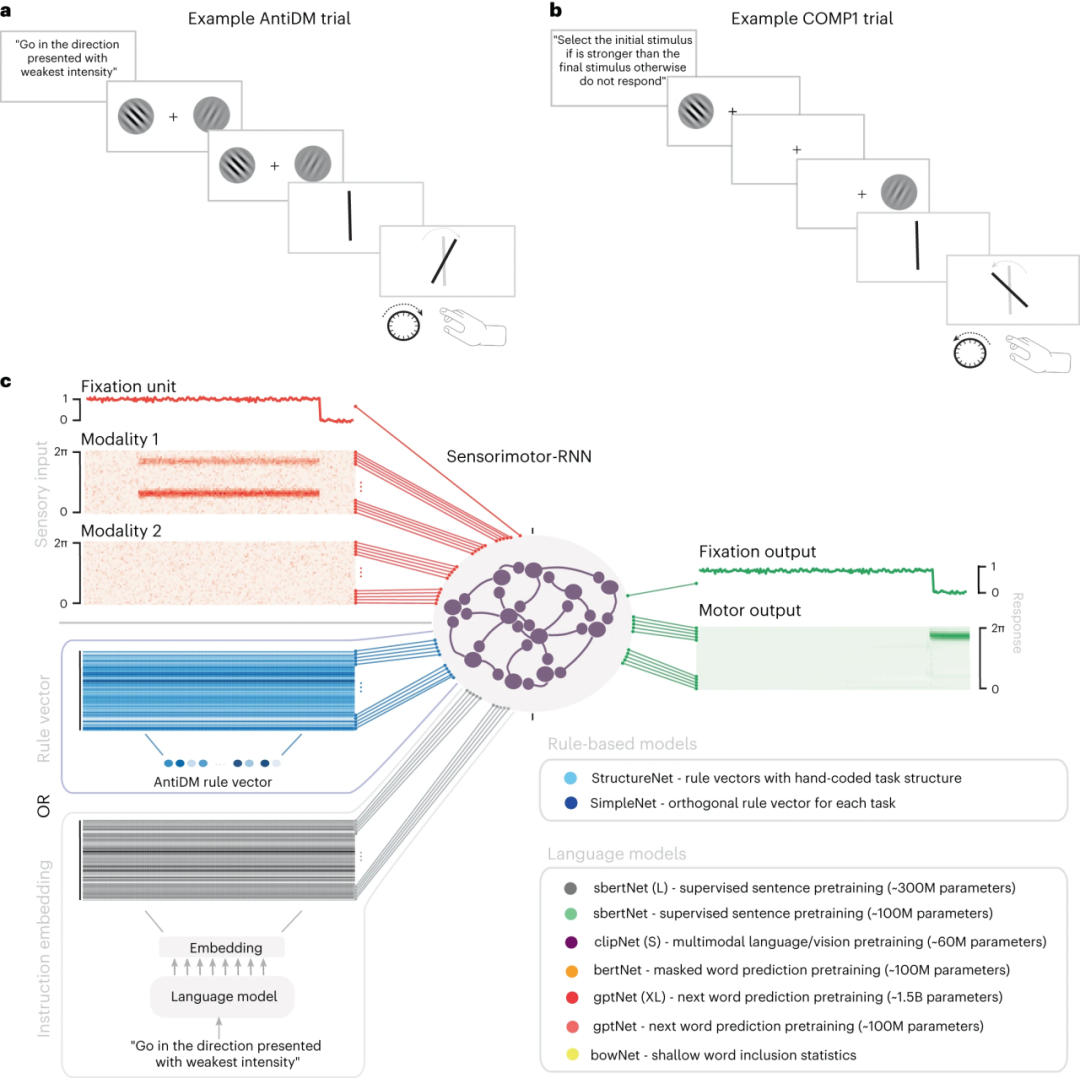该研究训练递归神经网络(RNNs)模型执行一系列心理物理任务,利用预训练语言模型处理每个任务嵌入的自然语言指令。研究中表现最好的模型可以利用这些嵌入来进行全新的模型,平均正确率达到83%。通过利用指令嵌入和任务表示的共享组合结构,模型能对练习过任务和新颖指令之间关系进行推断,从而可以很好地推断出未见任务所需的感觉运动转换。该研究还构建了一个人工神经网络,可以仅基于其观察到的感觉运动来为任务提供语言描述。