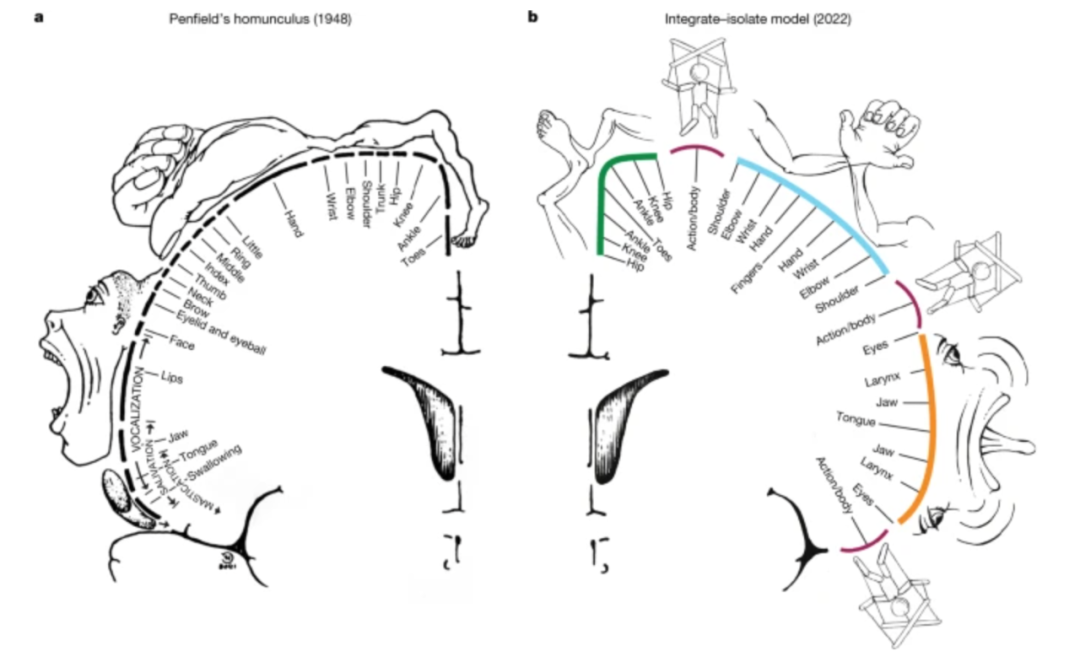 ▷图5:左:彭菲尔德当年绘制的小人模型;右:多森巴赫团队绘制的修正后的小人模型。其中标红部分为经典小人模型无法解释的部分。图源:Nature