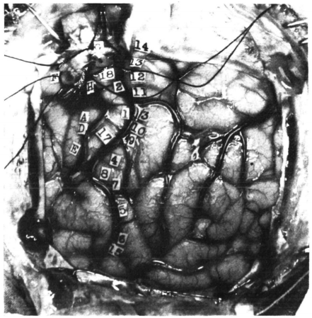 在每次手术过程中,彭菲尔德会在患者的大脑上放置编号的小标签,并详细记录通过电刺激特定区域所触发的具体反应(见下图):