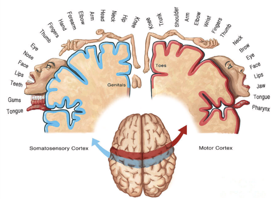 神经学和神经科学界最为人称道的标志之一,莫过于皮质小人模型(cortical homunculus,又称侏儒运动图)。这一模型以其不成比例的身体部位在大脑的特定区域的展示,形象地展示了身体是如何被系统性地映射到感觉和运动皮层上,揭示了大脑中分配给各个身体部位的相对比例。