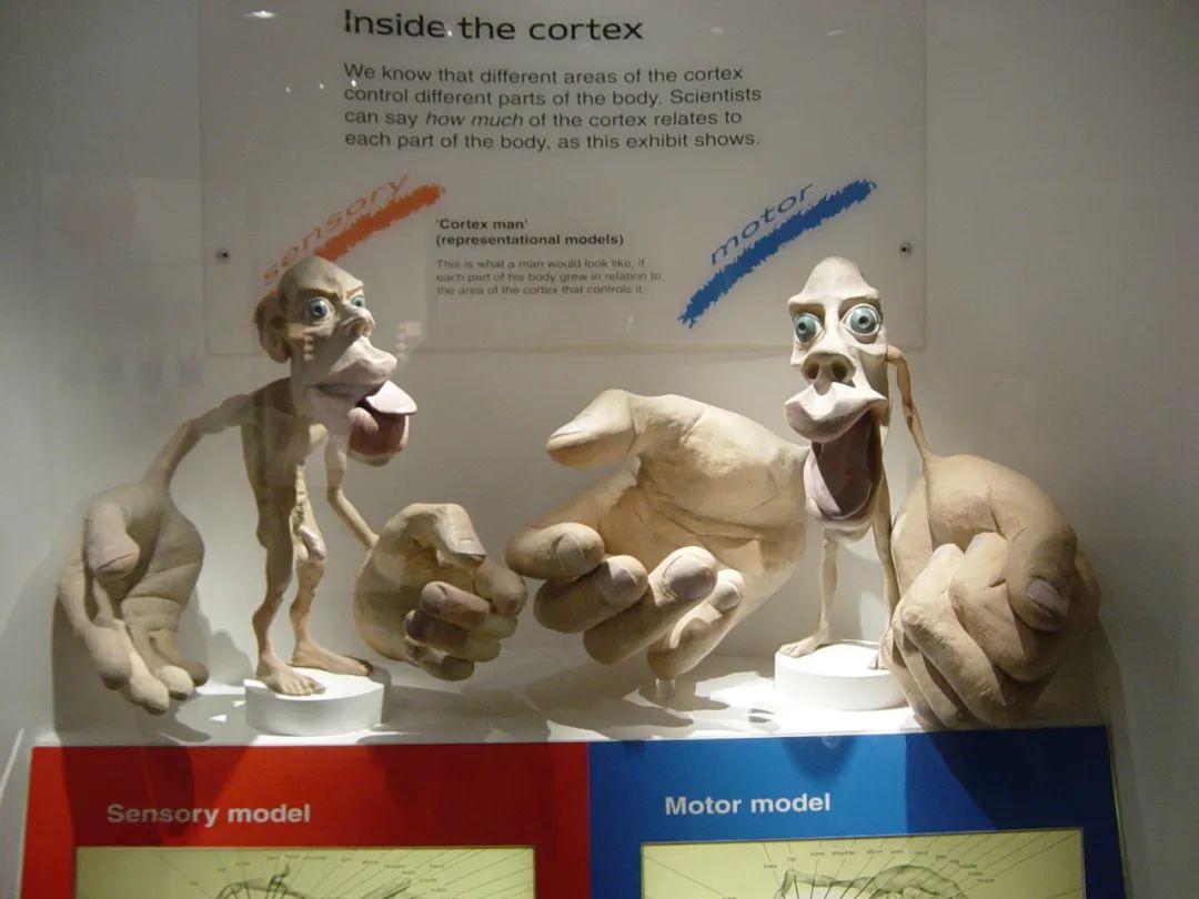 ▷图2:伦敦自然史博物馆中展示的三维感官小人与运动小人模型,展示了身体如果根据控制各部位运动的大脑皮质的分布情况生长,将会是什么样子的。图源:Dr. Joe Kiff/wiki
