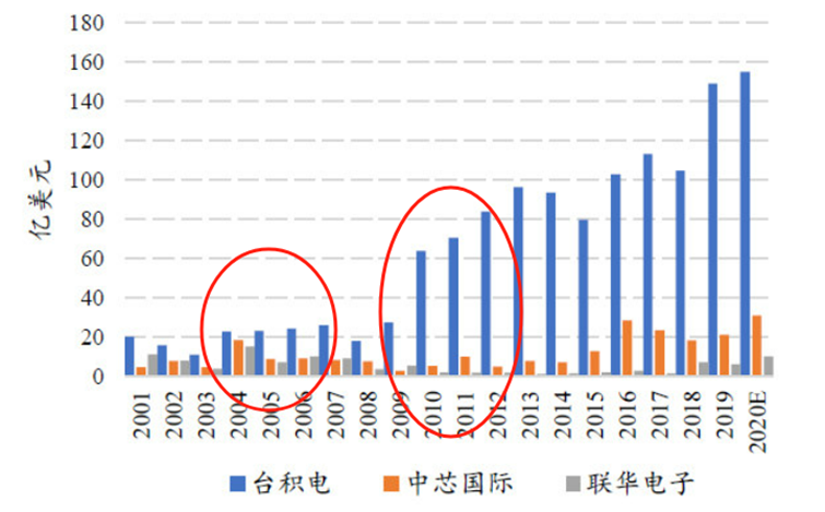 2004年,台积电和中芯国际的研发支出几乎是同一水平(仅差4亿美元),但在随后的行业低谷中,双方则做出了不同的规划。台积电加码研发、中芯国际收缩,双方技术差距逐步拉开。2008年全球金融危机时,台积电依旧保持投资,而且2010年更是加大了手笔,从而奠定了稳稳的一哥地位。