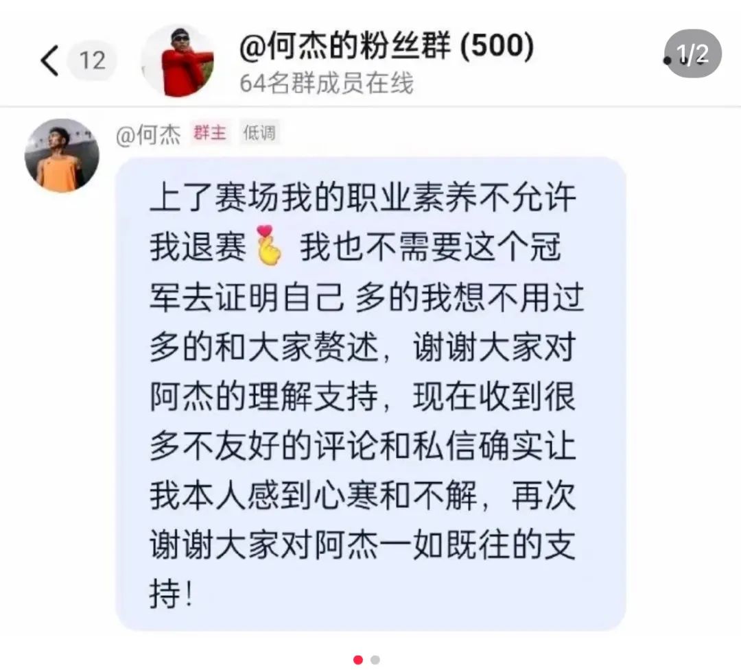 有网友晒出何杰本人在粉丝群中的回复,当事人表示:上了赛场我的职业素养不允许我退赛。我也不需要这个冠军证明自己。有网友表示,何杰在本场比赛的前5公里只用时14分40秒左右,后段只是因为身体不适导致状态不佳,何杰在赛后采访中也表示自己还没从感冒中恢复。