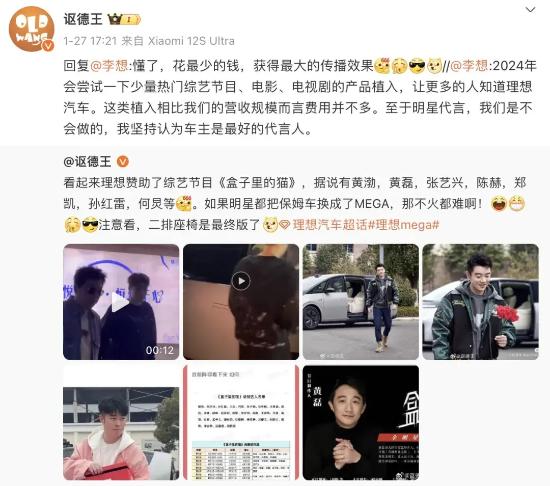 今年初有网友发现综艺《盒子里的猫》中出现了理想的身影,对此理想CEO李想在微博上回复,2024年会尝试少量热门综艺、电影、电视剧的产品植入,让更多的人知道理想汽车,并提到“这类植入相比我们的营收规模而言费用并不多”。