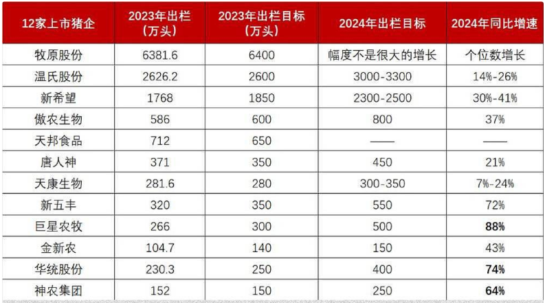 从美国经验看,规模化快速提升的节点,行业连续承受多年亏损下,有中小规模化养殖场掉队才能构成猪周期反转。回看我国猪周期,2023年全行业生猪养殖头均亏损76元,是自2014年以来,首个算总账全年亏损的年份。但全亏损未能扭转猪企的扩产动作,已发布出栏目标的猪企,2023年出栏头数同比增速少则个位数,多则出栏目标同比增长88%。
