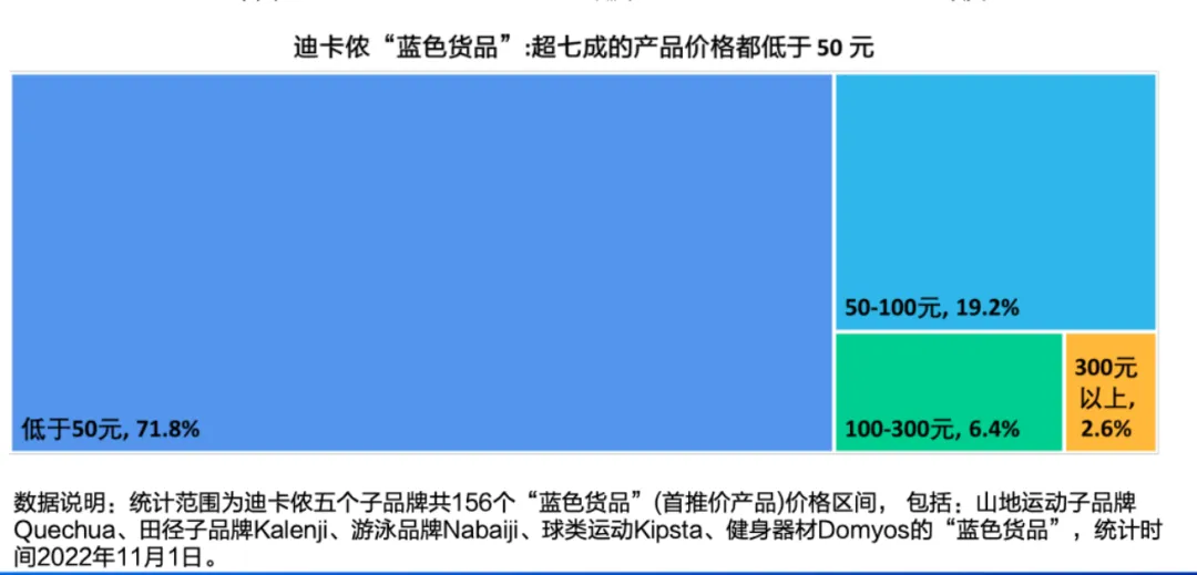 过去经常逛迪卡侬的消费者应该对门店中醒目的蓝色标价印象深刻,这类“蓝色货品”意味着有首推价优惠、是高性价比的入门级首选产品。据国海证券在2022年11月的统计,迪卡侬五个子品牌共156个“蓝色货品”中,超过七成产品价格低于50元。