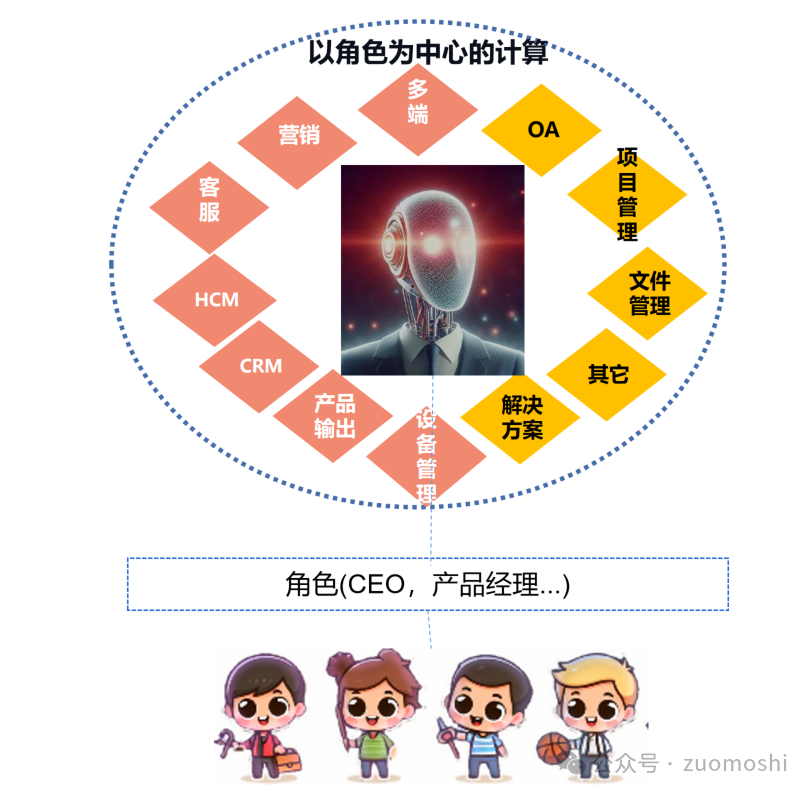 AI提供了概念理解和逻辑判断能力,所以调度本身可以分配给AI,人则更多的完成特定角色和现实世界中的映射。比如教育小孩,那就更多思考怎么才是一种好的教育方式,而不是怎么使用工具。这就是角色中心式计算。背后不在是if...else...的规则堆积,而是any...then...的智能。