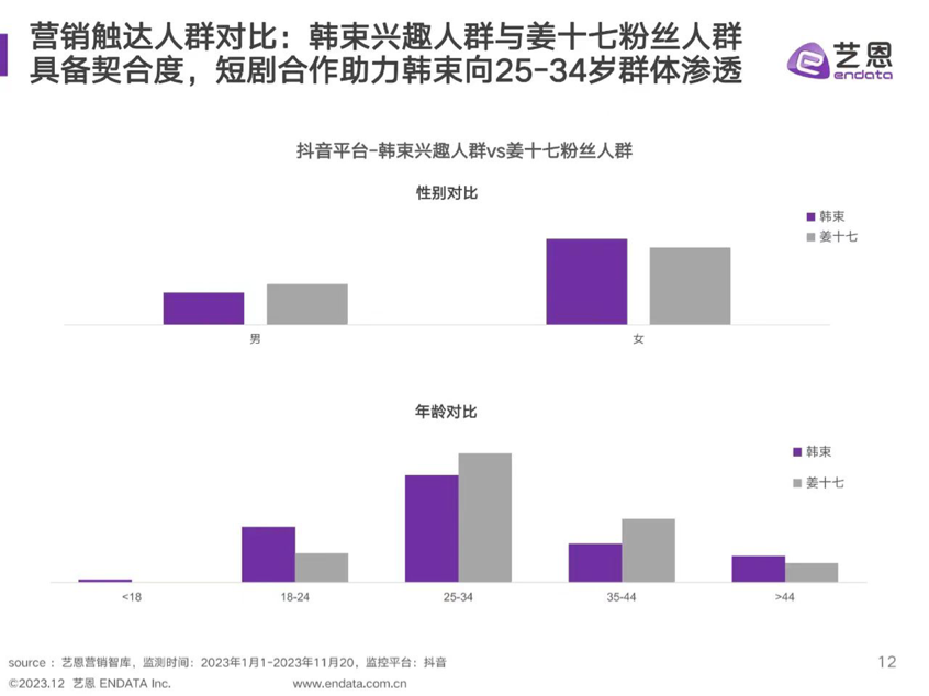 在营销触达人群中,短剧营销强调达人和品牌方具备高契合度。根据艺恩数据显示,韩束人群与姜十七粉丝人群剧被高契合度,主要向25—34岁人群进行群体渗透。