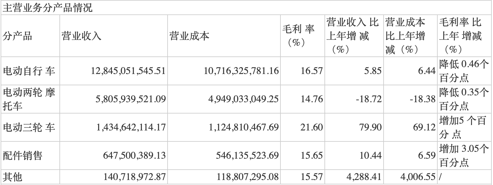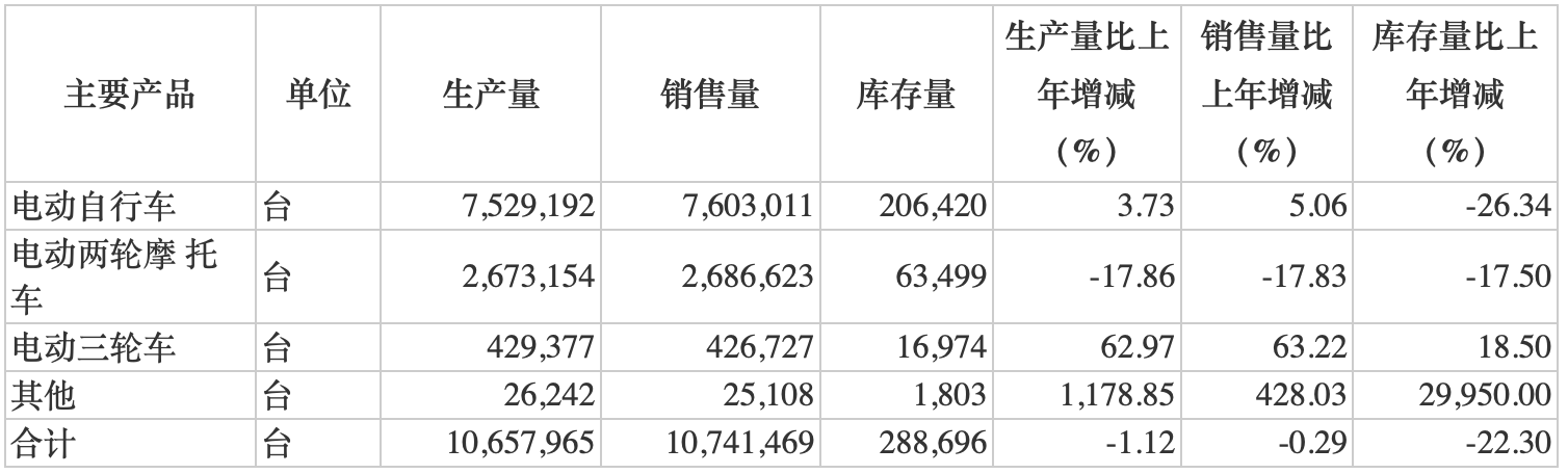 公司表示,去年面对行业竞争加剧、极端气候等不利因素,公司紧紧围绕“用户至上、卓越产品、精耕市场、精细运营”的战略主轴和向数智化科技公司转型的战略方向,继续专注于电动两轮车研发与制造的核心业务,严格执行年度经营计划,取得了较好的经营成效。