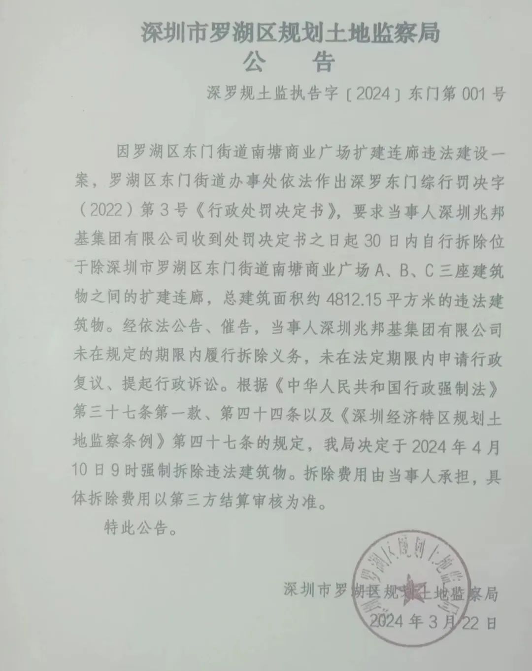 另一公告则显示,该区域为违法建设,违建涉及落户东门南塘商业广场A、B、C三座建筑物之间的扩建连廊,总建筑面积约4812.15平方米。相关落款显示为罗湖区规划土地监察局和罗湖区东门街道办事处,落款时间为2024年3月22日。