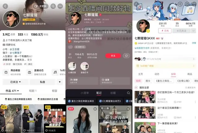 目前@七颗猩猩《重生》系列的热度主要集中在抖音、小红书、B站。相比之下,虽然“重生”系列在抖音的整体流量和热度更佳,但在B站网友的讨论度和参与度更强,而且该系列内容平均在B站有近千万的播放量。这意味着,真正在玩“霸总爽剧梗”的实际上是更年轻、主要在一二线城市的上升用户。