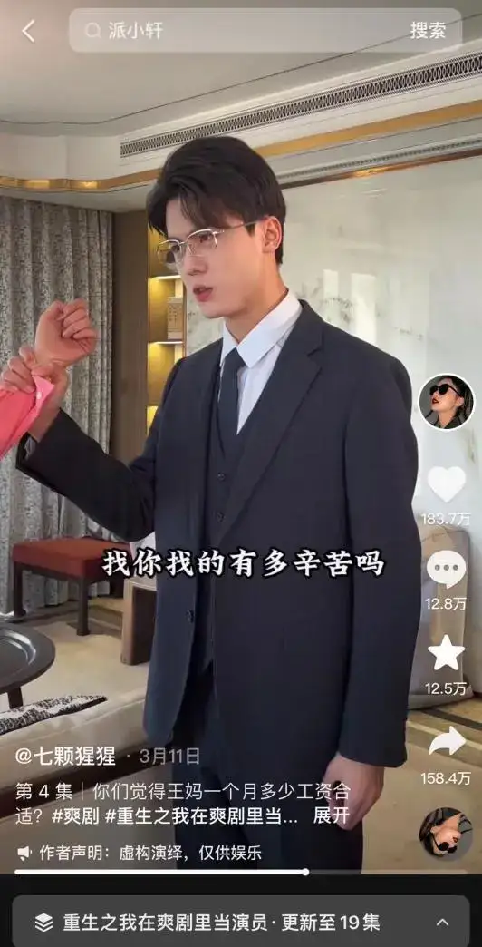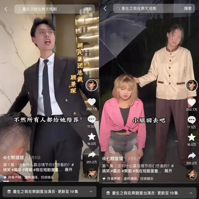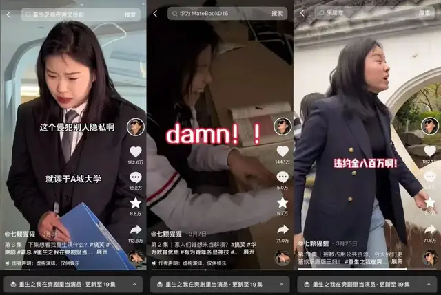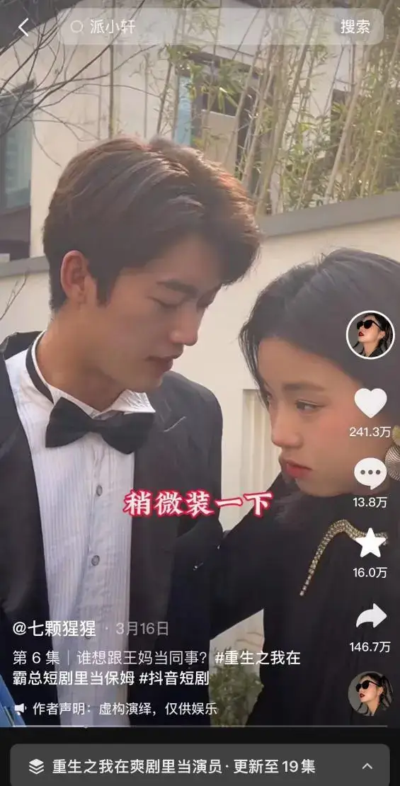 从对爽剧元素的提纯、到王妈视角的解构、再到网友的脑补,“重生之我在短剧当演员”,借助反差的内容、高频的更新和互动的再造梗,成功构筑起霸总短剧的终极——王妈宇宙。