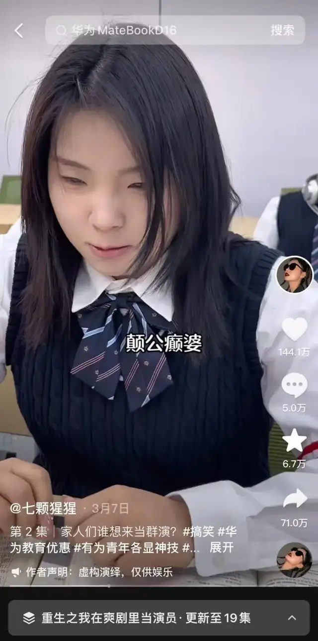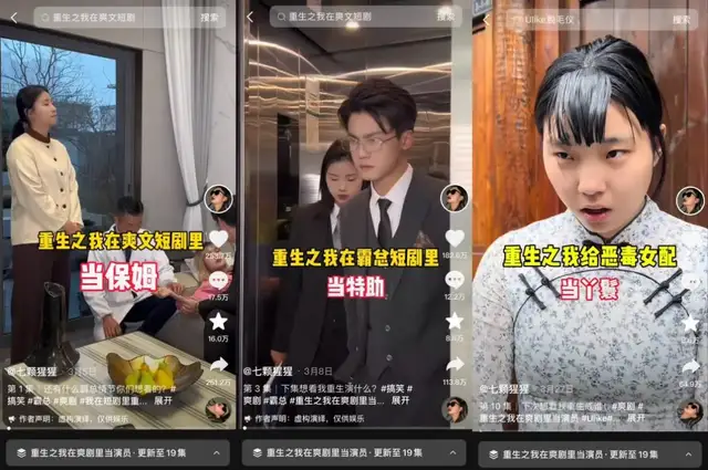近期,搞笑博主@七颗猩猩在《重生之我在短剧当演员》系列短视频中,以反霸总爽文套路的情节、打工人狠狠共情的配角视角快速火遍全网,并成功塑造了一个敢于直面随时发颠的男女主,甚至可以更颠的NPC——保姆“王妈”。