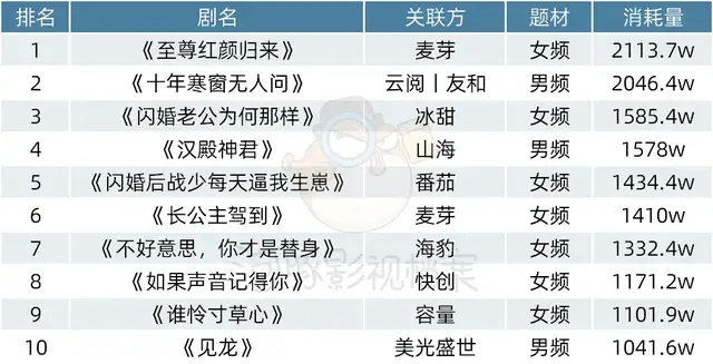 - 5.本周消耗量大幅度下跌,缺乏大爆款。相比《遥不可及的爱》一周近6500w的消耗量、《看子敬父》一周近4111.1w的消耗量来说,本周榜首《至尊红颜归来》仅有2113.7w。